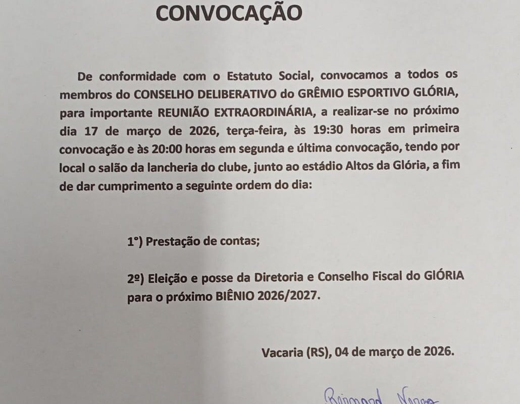 De conformidade com o Estatuto Social, convocamos a todos os membros do CONSELHO DELIBERATIVO do GRÊMIO ESPORTIVO GLÓRIA, para importante REUNIÃO EXTRAORDINÁRIA, a realizar-se no próximo dia 17 de março de 2026, terça-feira, às 19:30 horas em primeira convocação e às 20:00 horas em segunda e última convocação, tendo por local o salão da lancheria do clube, junto ao estádio Altos da Glória, a fim de dar cumprimento a seguinte ordem do dia:
